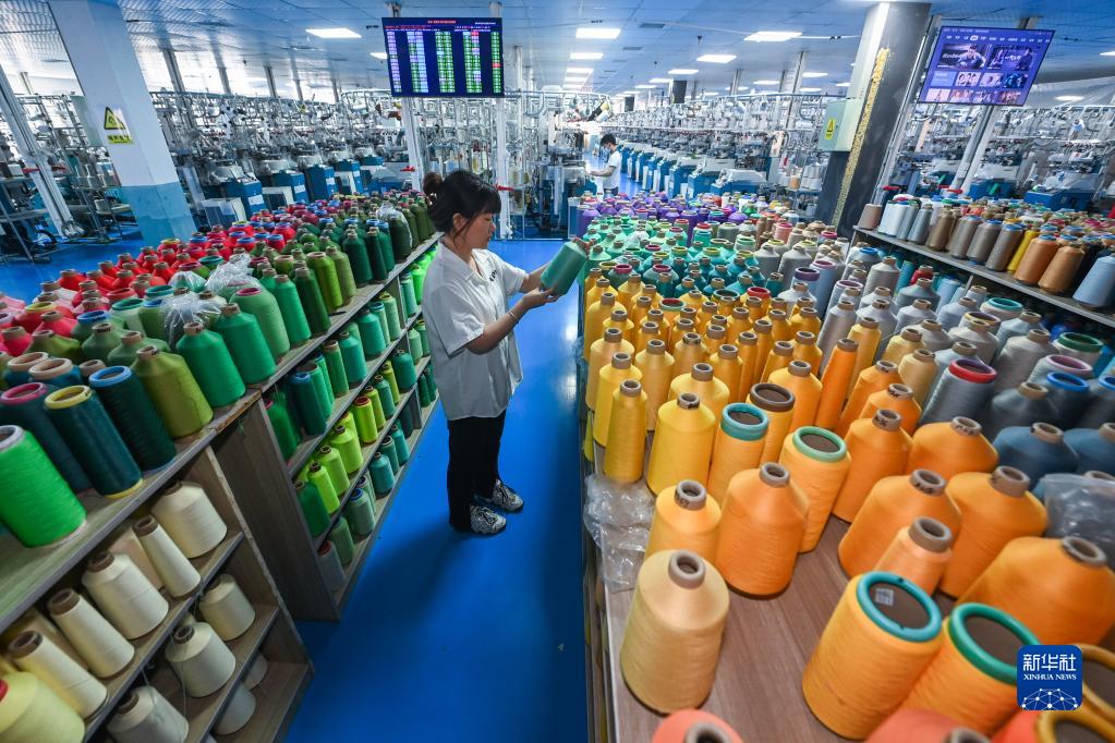 5月25日,在位于浙江省诸暨市大唐街道的友润袜业有限公司的数字化生产车间内,工作人员在拣选彩色纱线。