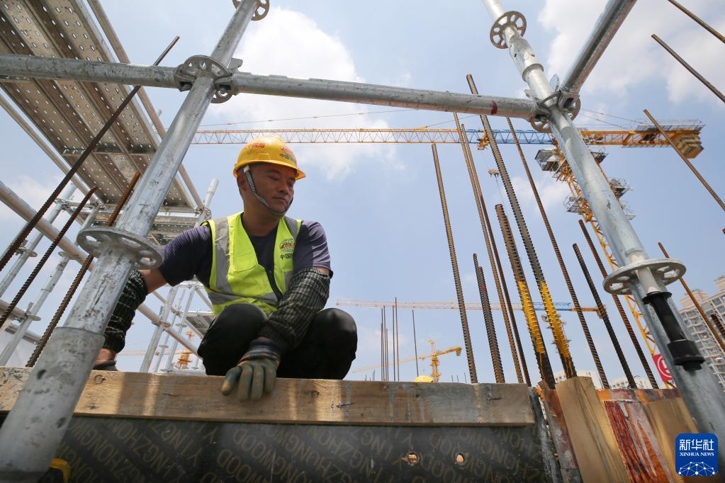 5月25日,工人在彭一小区旧住房改造项目工地上进行混凝土墙体钢筋绑扎作业。