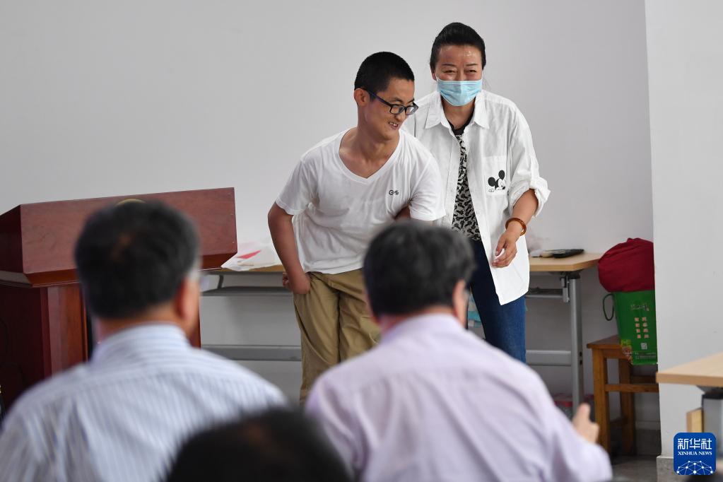 5月24日,完成论文答辩的谢炎廷和母亲一起向老师同学们鞠躬致谢。新华社记者 陈斌 摄