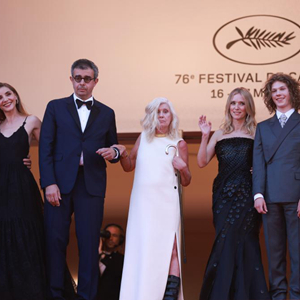 5月25日,在法国戛纳举行的第76届戛纳国际电影节上,法国导演凯瑟琳·布雷亚(右三)携主创踏上影片《去年夏天》首映礼红毯。