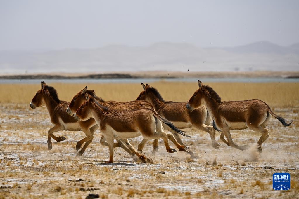 一群藏野驴在阿尔金山国家级自然保护区奔跑(5月23日摄)。