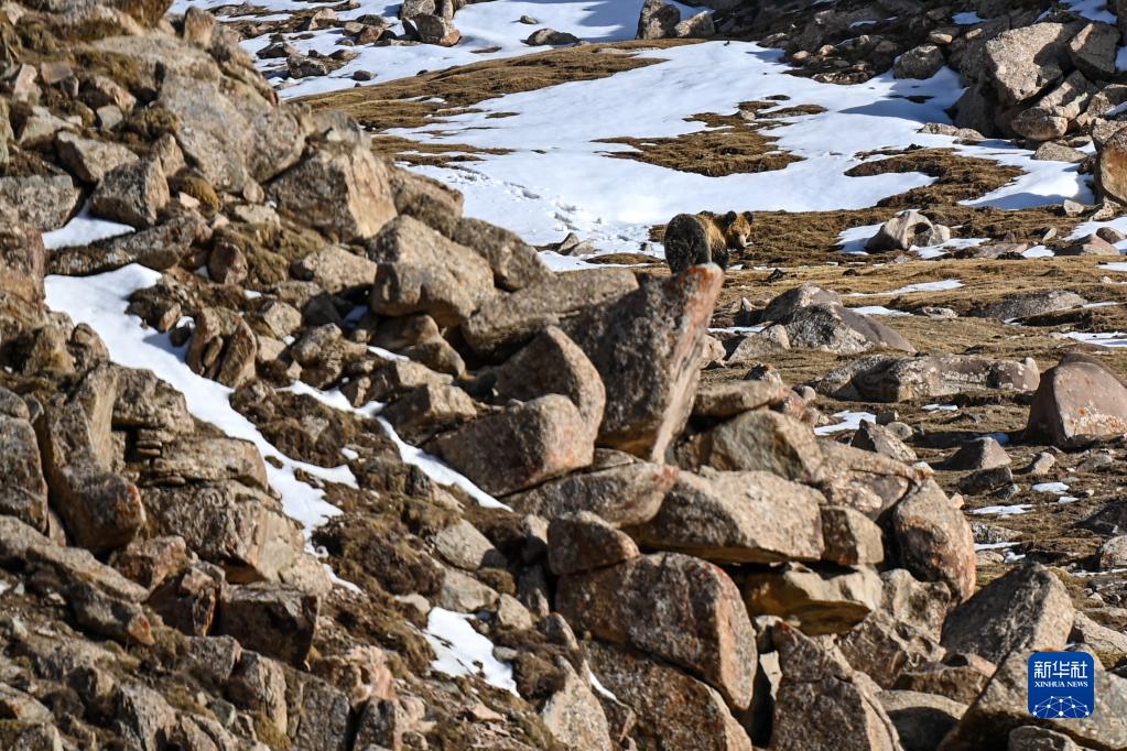 一头藏马熊在阿尔金山国家级自然保护区觅食(5月23日摄)。