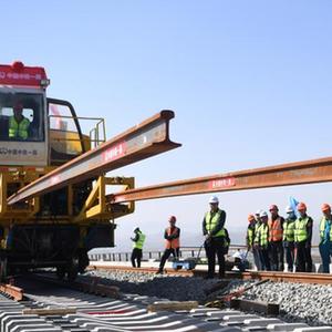 当日,在甘肃省武威市天祝藏族自治县境内兰(兰州)张(张掖)三四线铁路铺轨施工现场,一体式牵引车在中铁一局施工人员的操作下,将一组500米长的钢轨精准铺设在道床上,标志着由中铁一局承建的兰张三四线铁路兰州至武威段进入全线铺轨阶段。