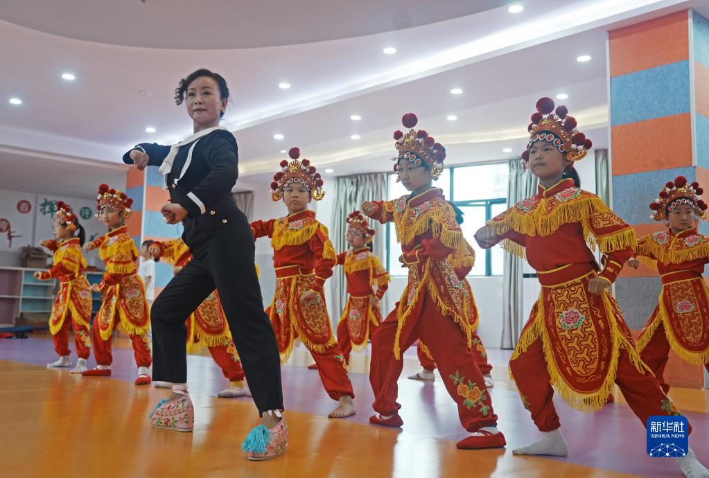 在江西省宜黄县水北新区小学,老师带领学生们排练六一儿童节的宜黄戏节目(5月25日摄)。