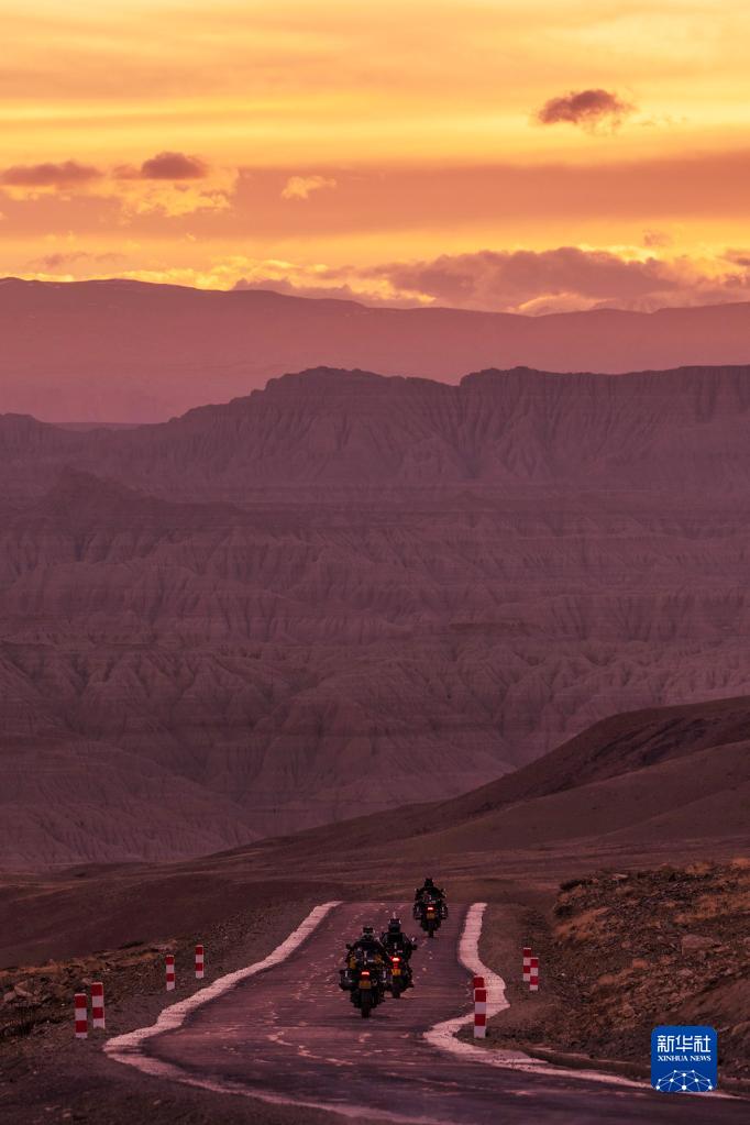 夕阳时分,三位骑士驾驶摩托车驶向札达土林(5月25日摄)。