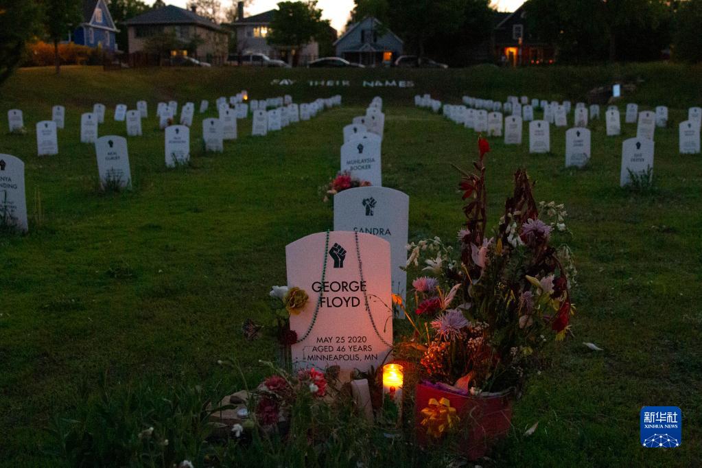 这是5月25日在美国明尼苏达州明尼阿波利斯市拍摄的弗洛伊德墓碑前摆放的鲜花。