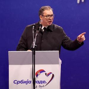 5月26日,塞尔维亚总统武契奇在首都贝尔格莱德的一场集会上发表讲话。