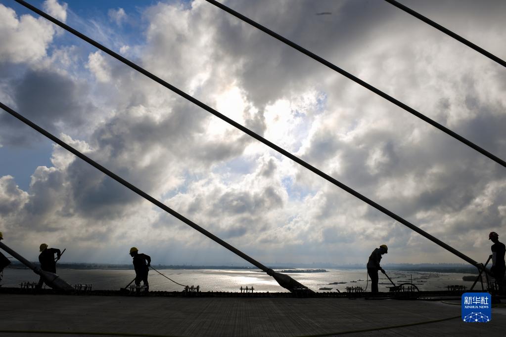 5月25日,建筑工人在鹭洲大桥修筑桥面。