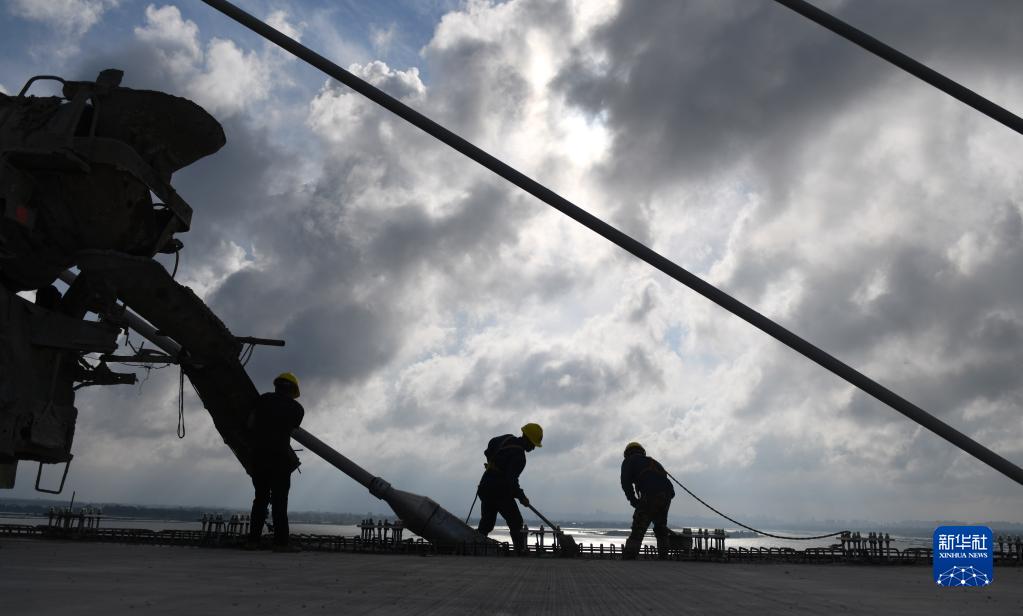 5月25日,建筑工人在鹭洲大桥修筑桥面。