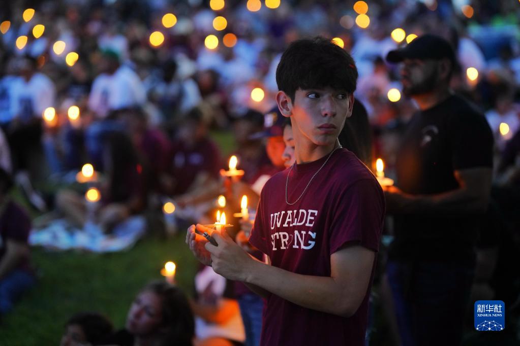 5月24日,在美国得克萨斯州小城尤瓦尔迪,人们参加守夜仪式悼念校园枪击遇害者。