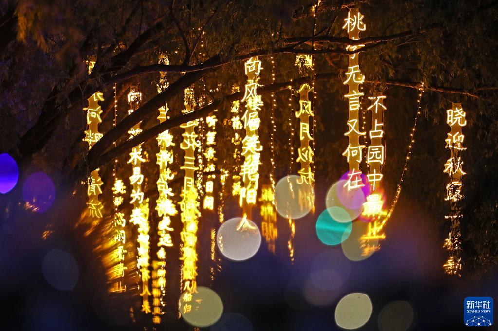 近日,沈阳市万泉公园打造的一条诗词漫道成为游客和市民的网红打卡地。每当夜幕降临,几十首古诗词彩灯在这条300余米道路的树梢枝头熠熠闪烁,以诗入景,一步一诗。
