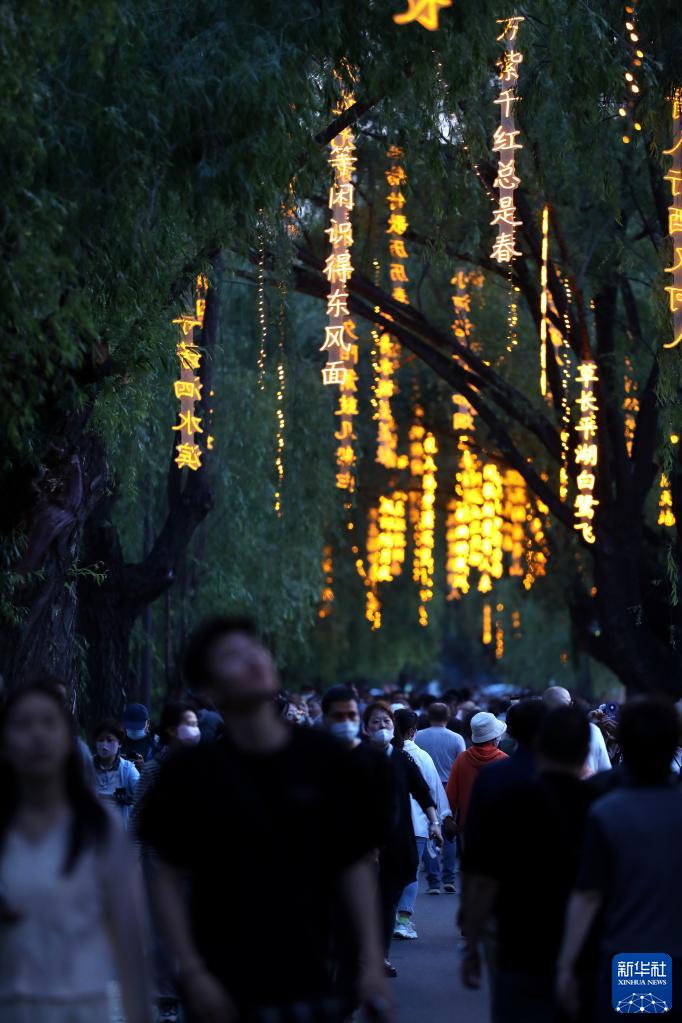近日,沈阳市万泉公园打造的一条诗词漫道成为游客和市民的网红打卡地。每当夜幕降临,几十首古诗词彩灯在这条300余米道路的树梢枝头熠熠闪烁,以诗入景,一步一诗。