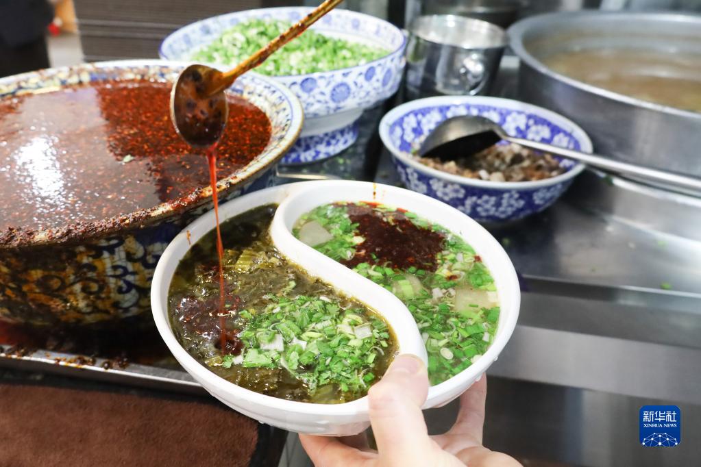 这是5月26日在兰州市城关区舌尖尖牛肉面美食坊拍摄的“鸳鸯牛肉面”产品。