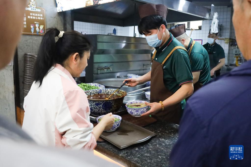 5月26日,在兰州市城关区的一家牛肉面馆,顾客在窗口取面。