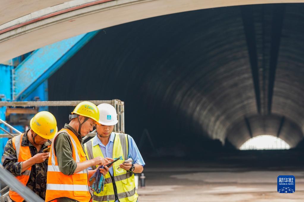 5月26日,技术人员(右一)和工人在新森大道隧道工程的装配式拱形隧道施工现场进行拼装作业的施工技术交流。