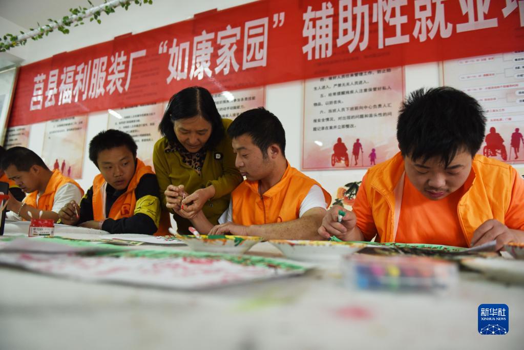 5月25日,在山东省日照市莒县福利服装厂“如康家园”,美术老师在指导职工学习绘画。