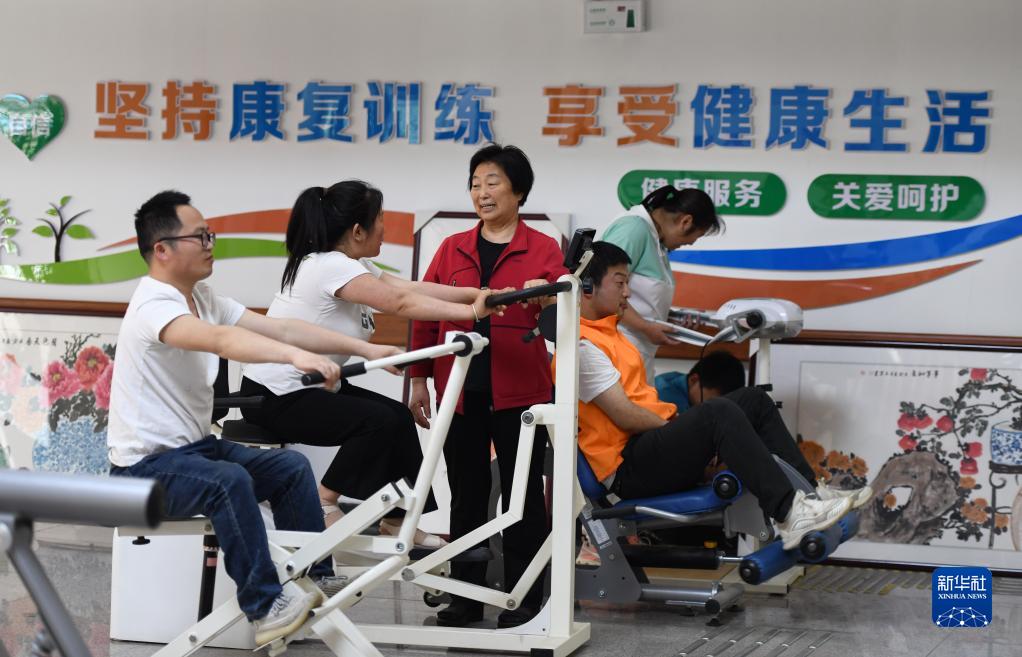 5月25日,在山东省日照市莒县福利服装厂“如康家园”,厂长辛兴芬(左三)向工人了解康复情况。