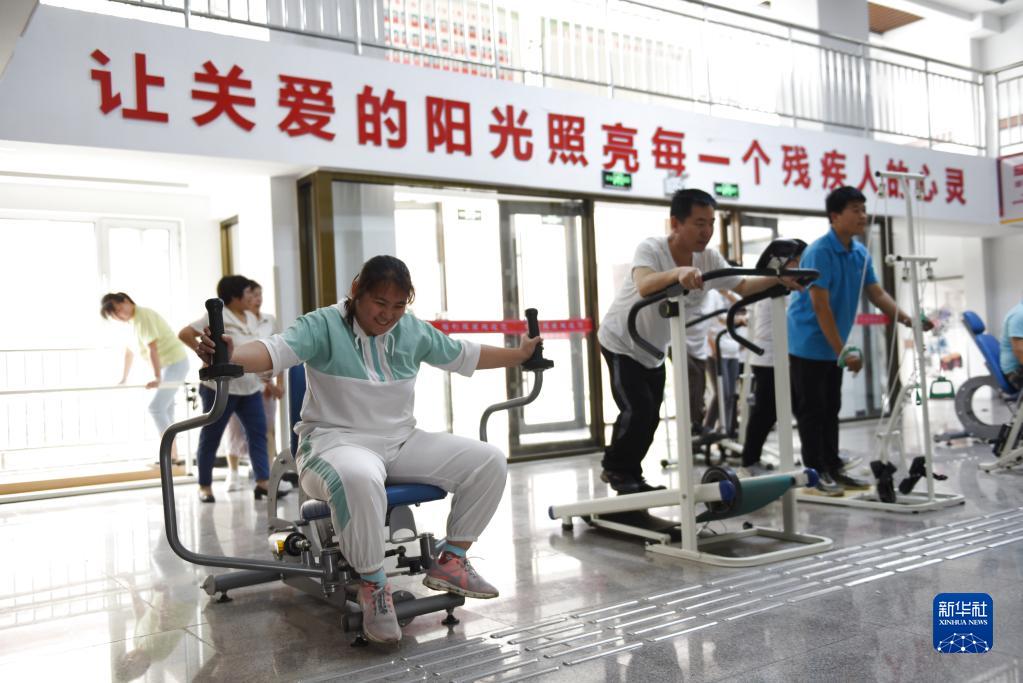 5月25日,在山东省日照市莒县福利服装厂“如康家园”,工人在进行康复训练。