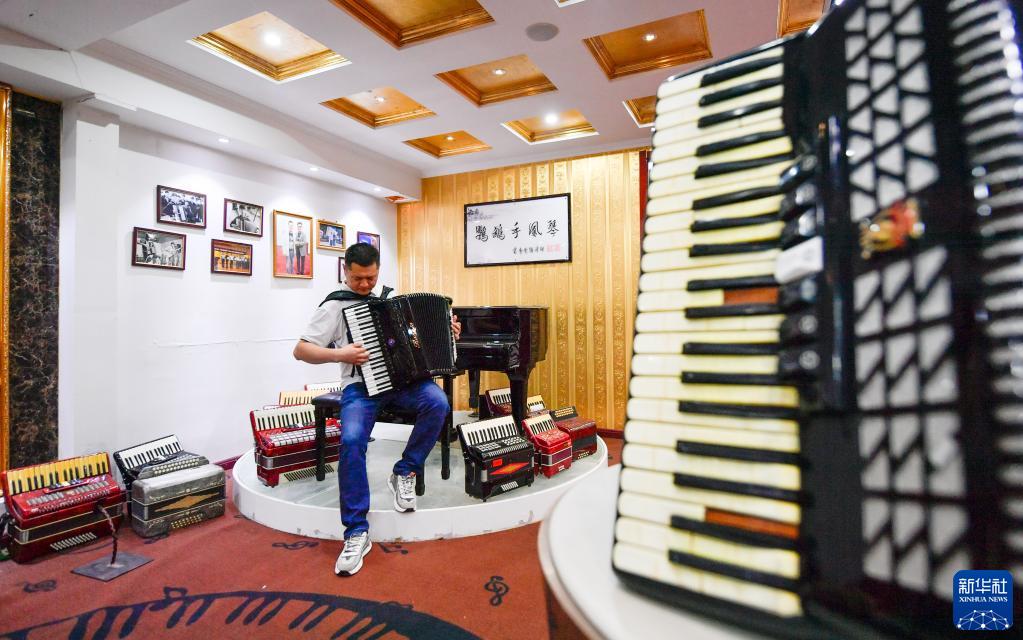 5月25日,在天津鹦鹉乐器有限公司,工作人员用“罗尼”牌手风琴演奏乐曲。