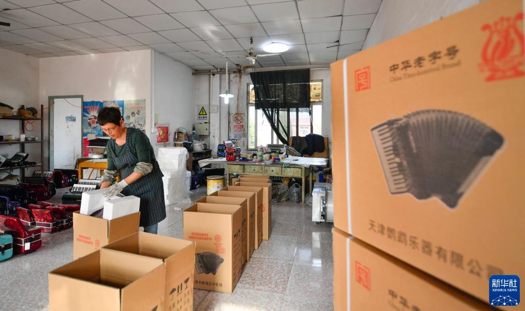 5月25日,在天津鹦鹉乐器有限公司,工作人员在包装成品手风琴。