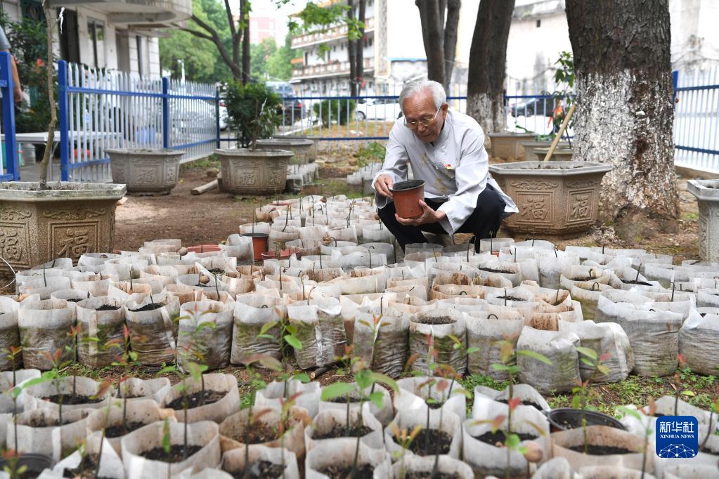 吕超锦在广西玉林师范学院划分的试验区查看新培育的蒜头果苗生长情况(5月24日摄)。