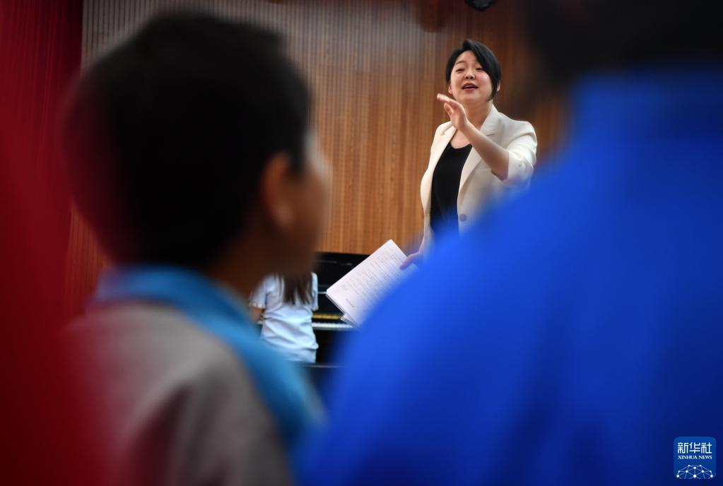 5月24日,在许昌市特殊教育学校,志愿者白一童指导盲童合唱团的团员进行练习。