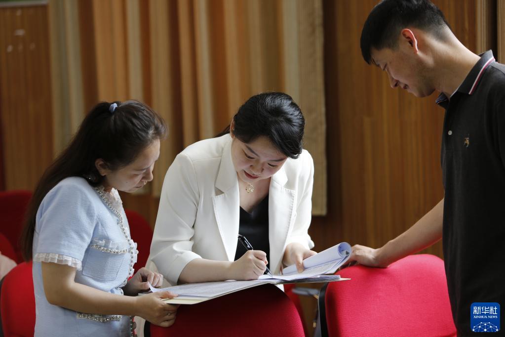 5月24日,在许昌市特殊教育学校,忽晓(左)在盲童合唱团排练前与另外两位志愿者交流。