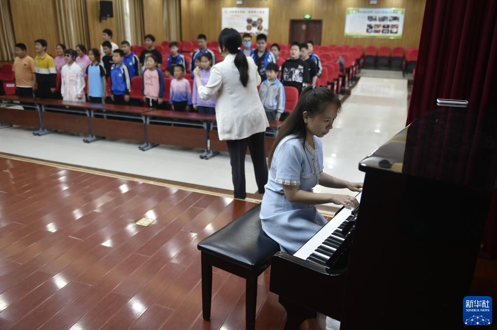5月24日,在许昌市特殊教育学校,盲童合唱团的团员练习合唱,忽晓进行钢琴伴奏。