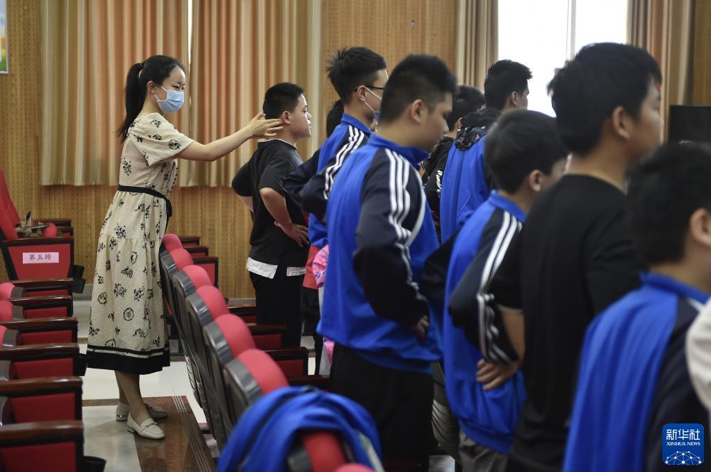 5月24日,在许昌市特殊教育学校,志愿者(左一)在辅导盲童唱歌时的身体姿态。