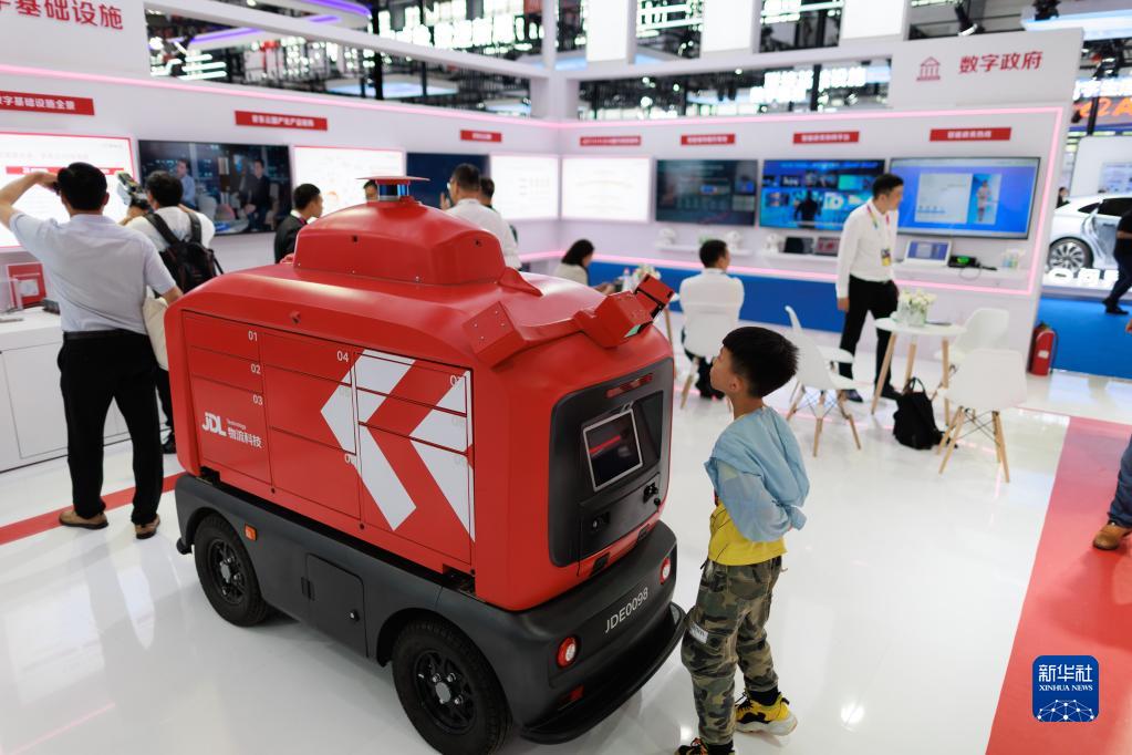 5月26日,一名小朋友在“数博会”上参观物流智能快递车。
