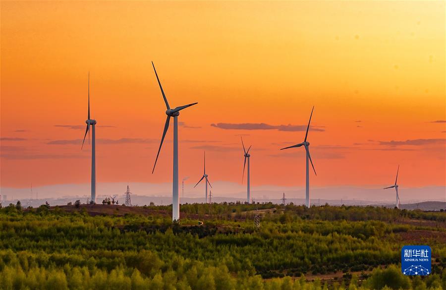 5月23日清晨拍摄的兴安盟乌兰浩特市呼和马场风力光伏发电场内的风机。