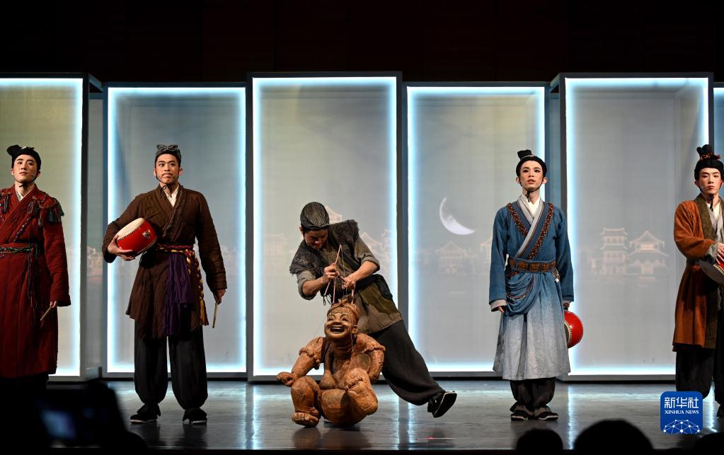 当日,中国国家博物馆联合中国传媒大学共同出品的原创文物活化舞台剧《盛世欢歌》在北京上演。该剧以汉代的击鼓说唱俑为切入点,生动再现了汉代俳优人的生命起伏。