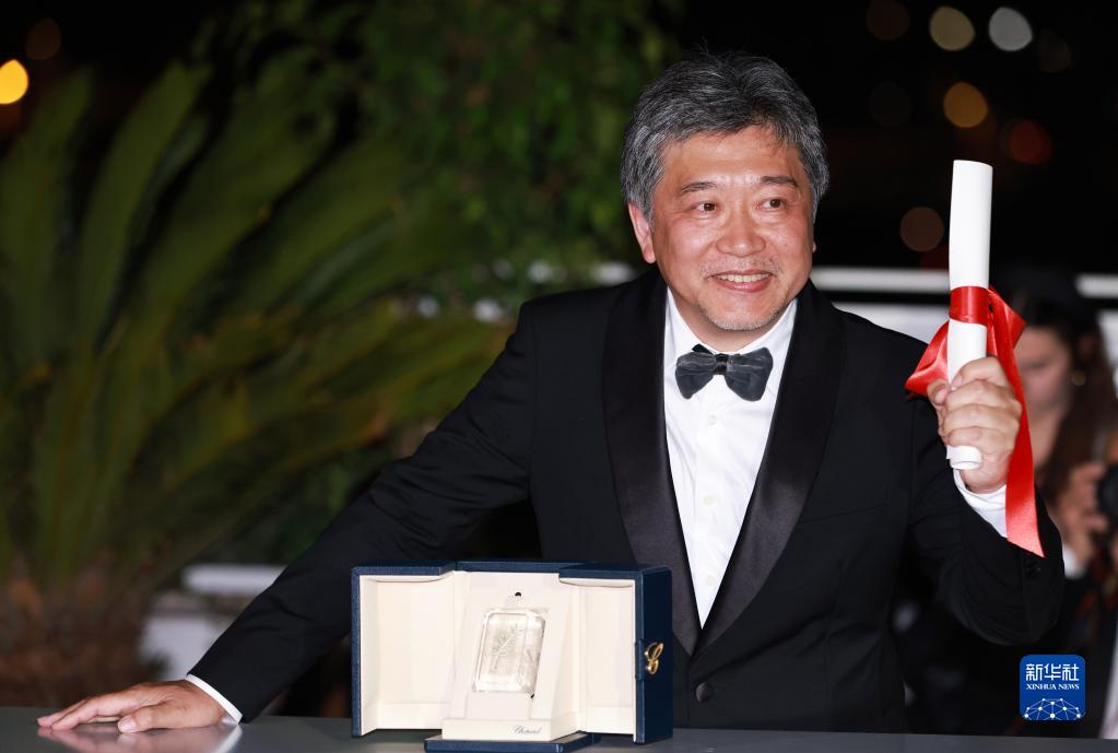 5月27日,在法国戛纳,日本影片《怪物》的导演是枝裕和展示奖杯。该片获得本届电影节最佳编剧奖。