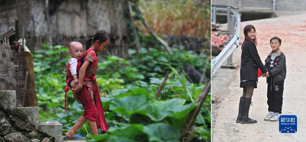 拼版照片:左图为2012年7月16日,在大化瑶族自治县板升乡弄勇村,10岁的蒙柔玉背着弟弟蒙宣朋去玩耍;右图为2023年1月20日,在大化瑶族自治县板升乡弄勇村,21岁的蒙柔玉(左)和12岁的弟弟蒙宣朋在一起。已经从幼师毕业的蒙柔玉,一边工作,一边学习舞蹈,为自己儿时的歌舞梦继续努力。