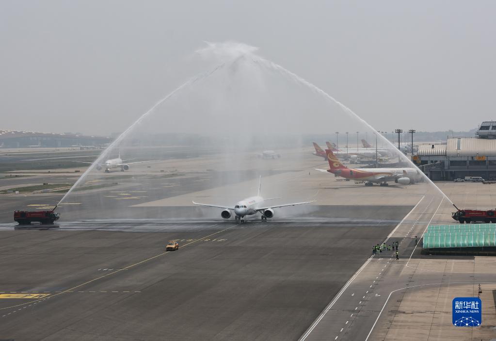5月28日,北京首都国际机场以水门礼迎接C919首个商业航班东航MU9191。