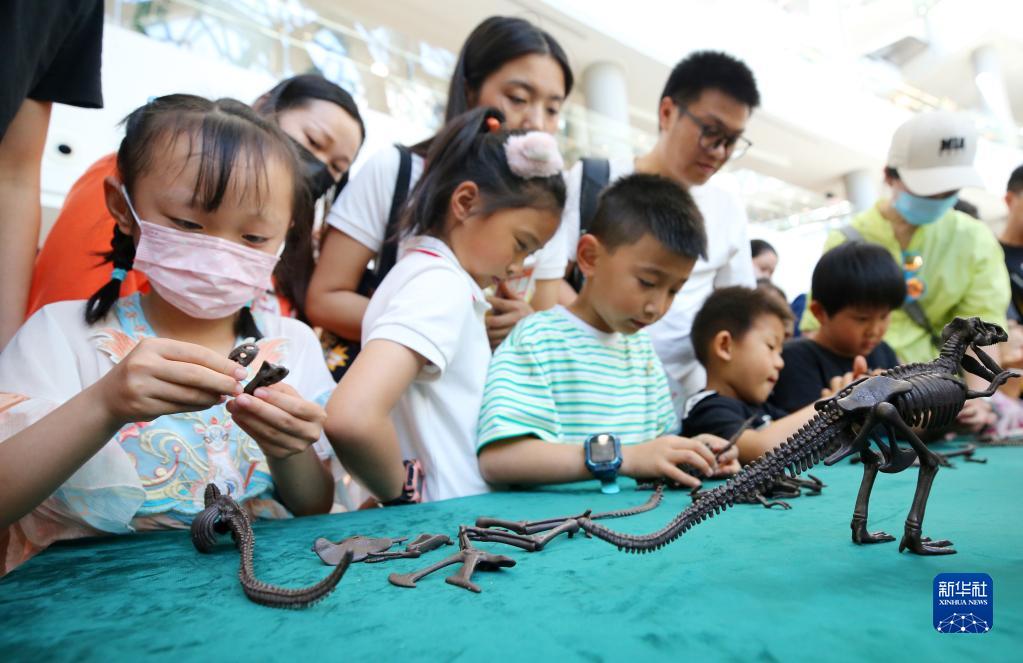 5月28日,小朋友们在活动中进行恐龙骨骼模型的拼装比赛。