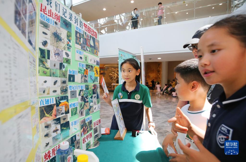 5月28日,几名小朋友在一个关于居民小区昆虫种类调查的展板前交流讨论。