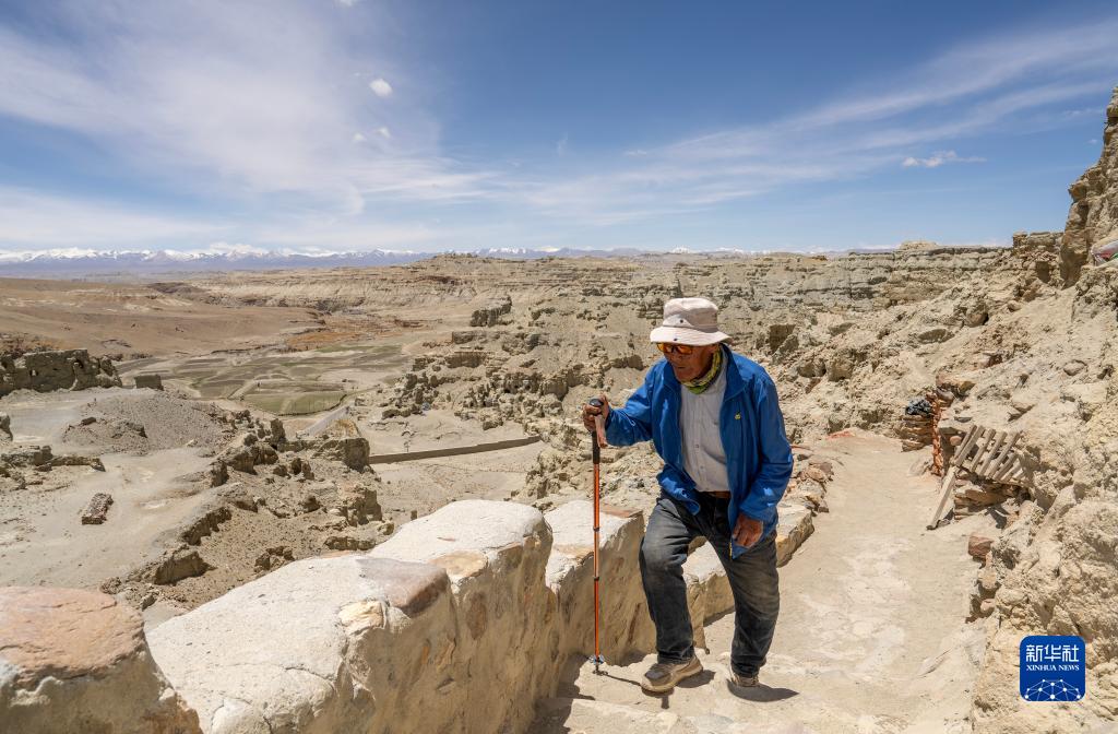 皮央石窟群所在的小山,就在西藏阿里地区札达县东嘎村仁增旺扎老人的家旁边。老人拄着拐棍,沿着陡峭的台阶,颤颤巍巍、一步一步,400多级台阶,用时近30分钟。