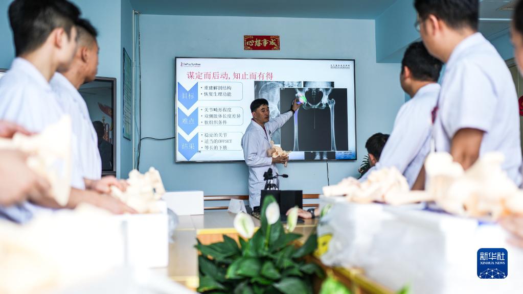 贵州省人民医院骨科主任医师通过3D打印模型向规培医生讲解髋关节疾病患者的治疗案例(5月25日摄)。