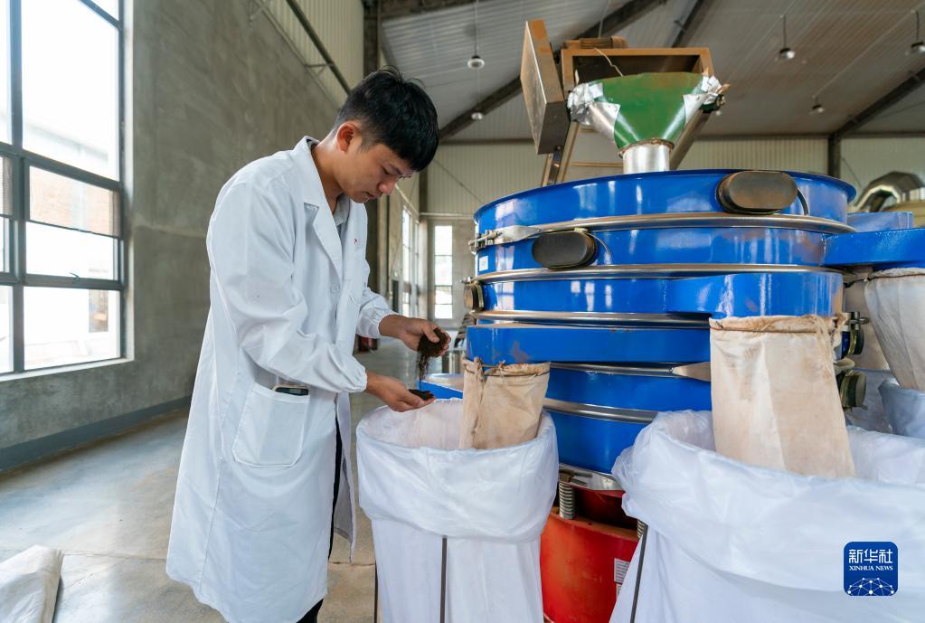 5月28日,一名工作人员在绿春县一家茶叶加工企业查看生产的红碎茶。