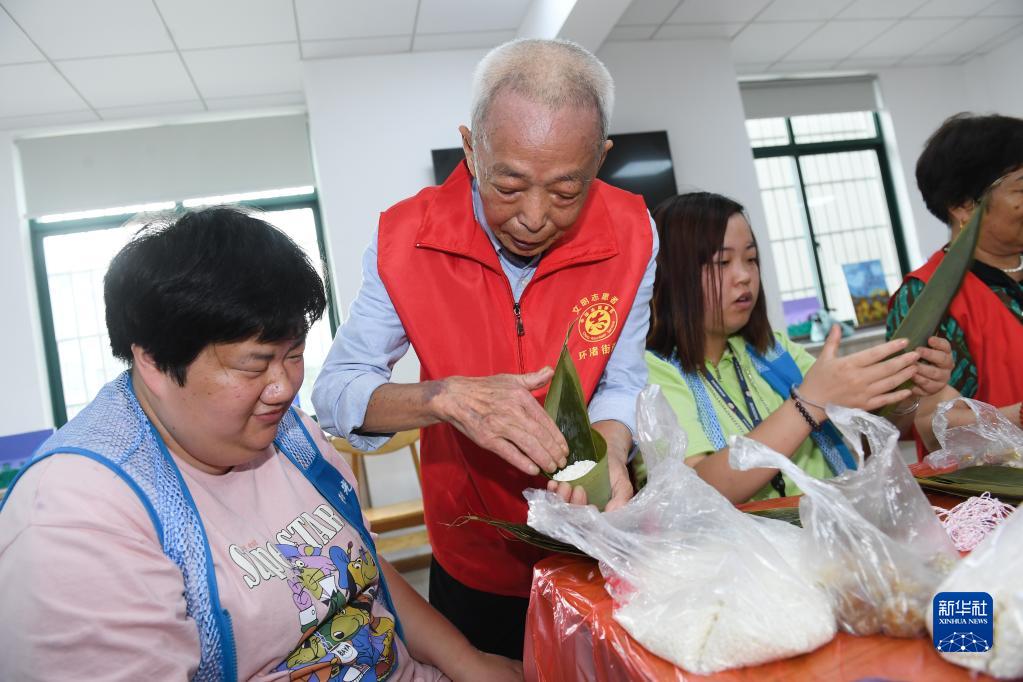 5月29日,在湖州市环渚街道玉堂桥社区组织的迎端午活动中,凌法林(左二)和其他志愿者一起指导残障人士包粽子。