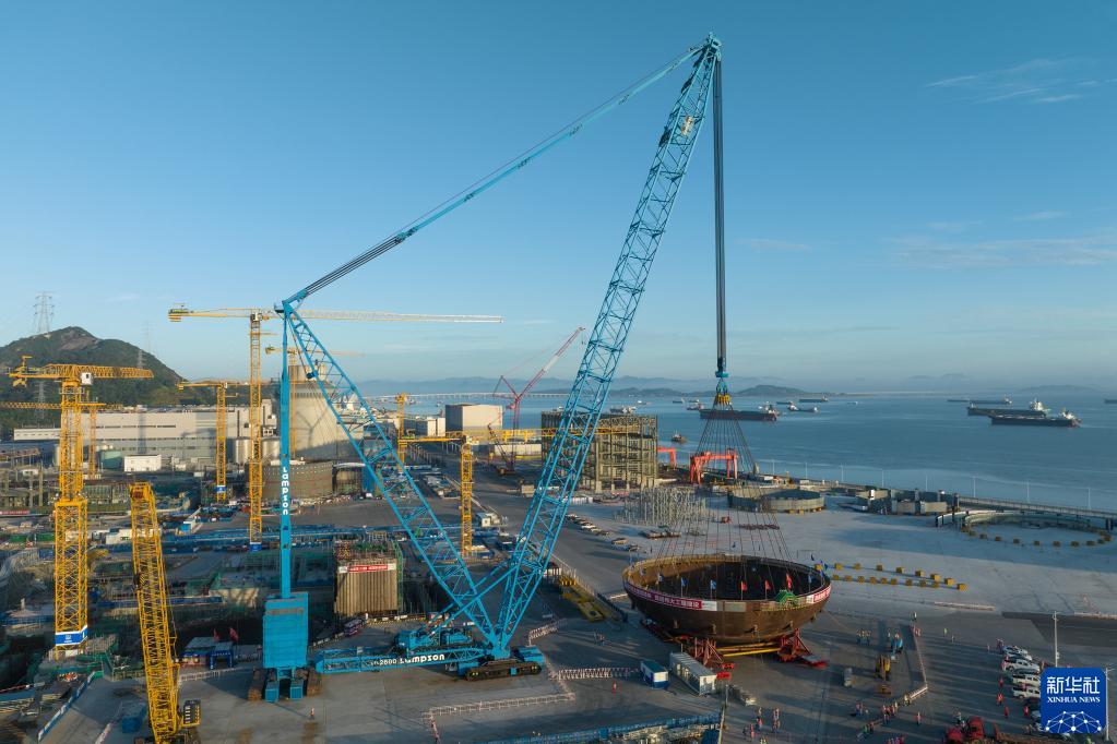 这是5月29日拍摄的三门核电二期工程4号机组核岛钢制安全壳底封头吊装现场(无人机照片)。