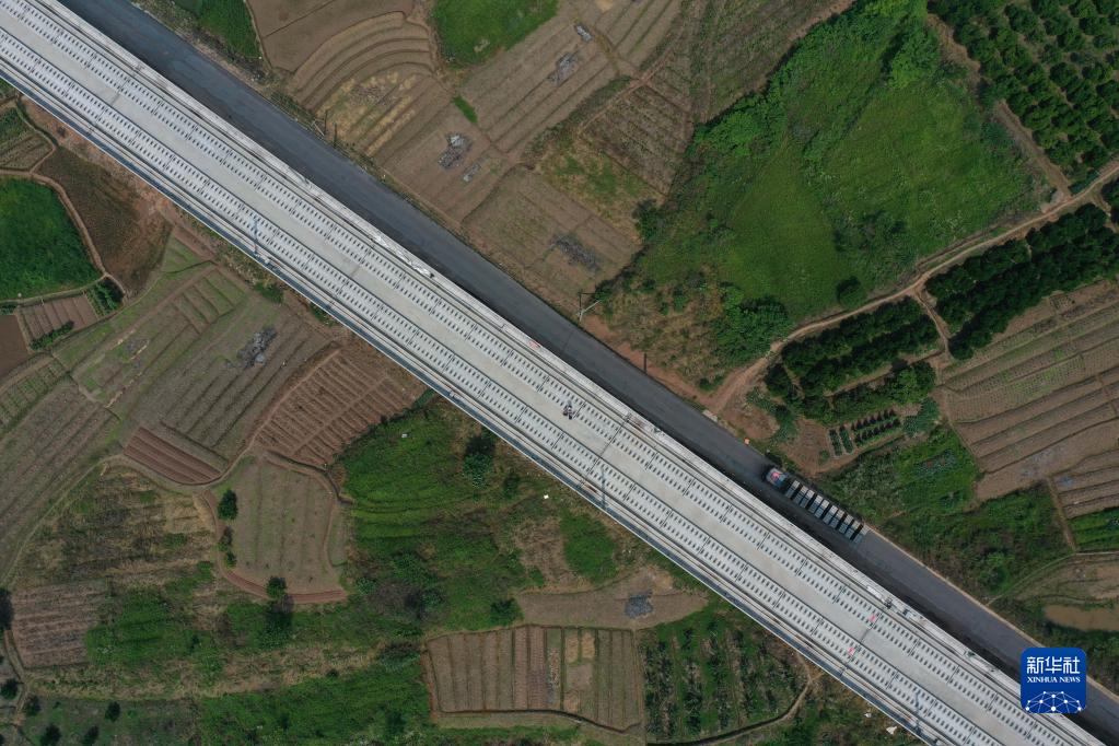 5月30日拍摄的杭衢铁路已完成无砟轨道施工的路段(无人机照片)。
