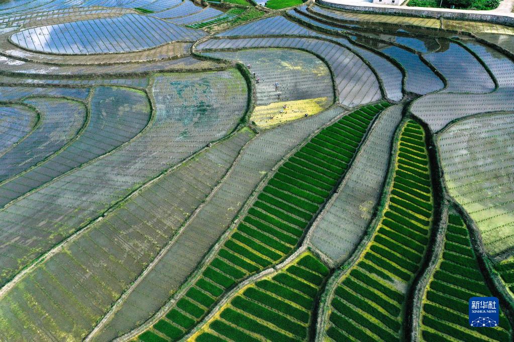 5月29日,村民在岑巩县水尾镇新场村的杂交水稻制种基地移栽制种水稻秧苗(无人机照片)。