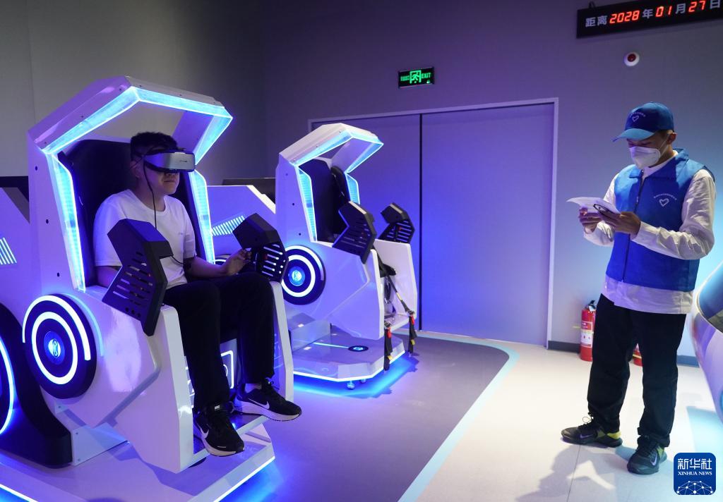 5月30日,观众(左)在科幻产业新技术新产品展现场体验一款VR(虚拟现实)设备。