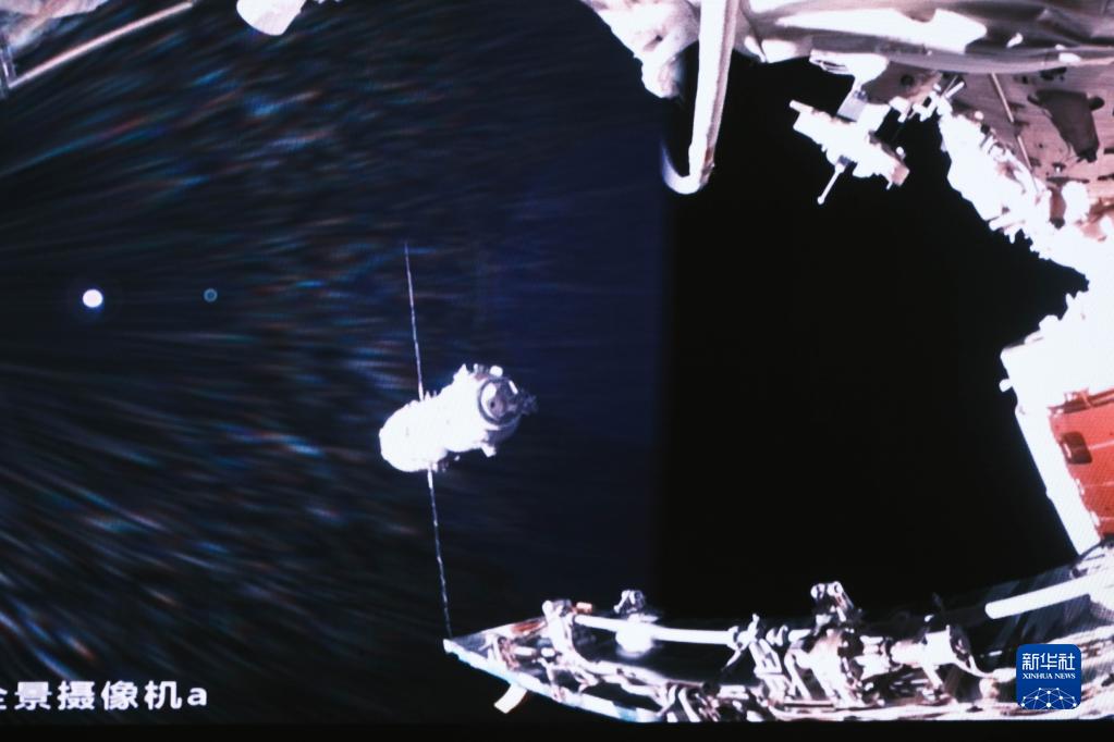 5月30日在北京航天飞行控制中心拍摄的神舟十六号载人飞船与天和核心舱进行自主快速交会对接的画面。