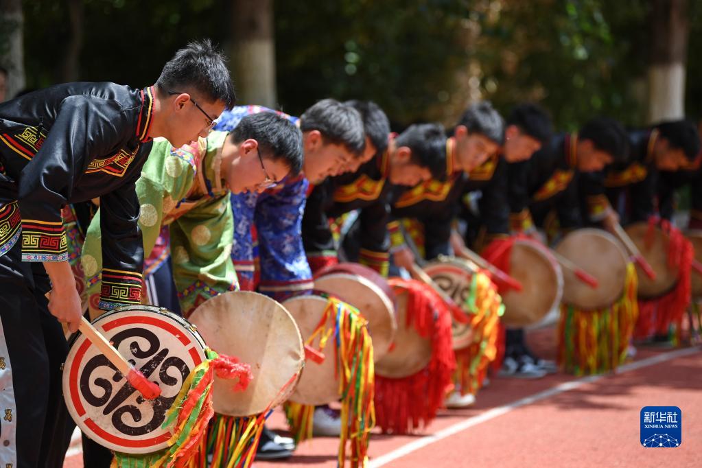 5月30日,四川省汶川中学高三学生用羌族羊皮鼓舞“减压”迎高考。