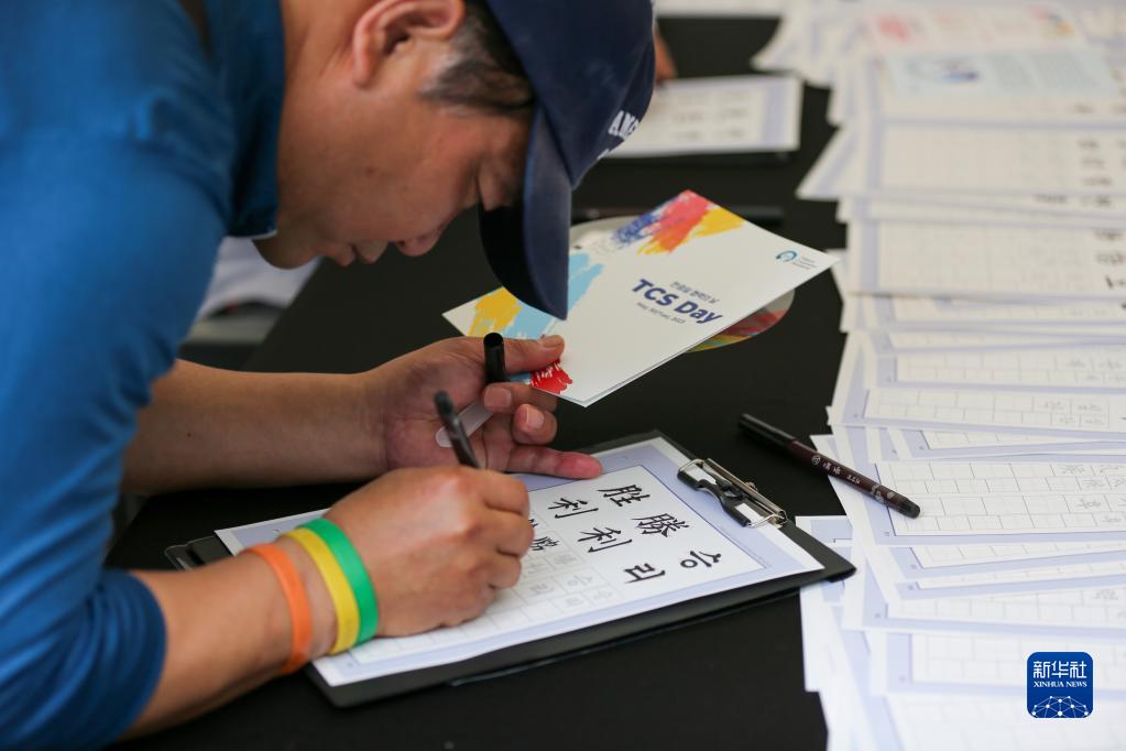 5月30日,在韩国首尔举办的“中日韩合作之日”庆祝活动中,参与者体验书法。