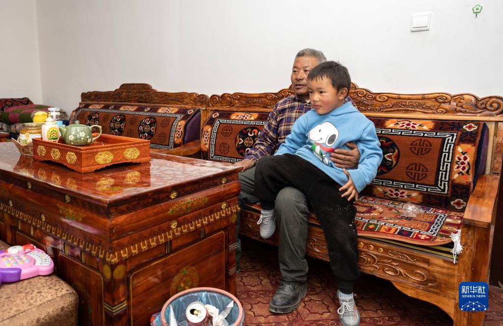 5月28日,洛桑占堆老人的儿子次仁久米和自己的孙子次仁顿珠在典角村的“五代房”里看电视。新华社记者 费茂华 摄