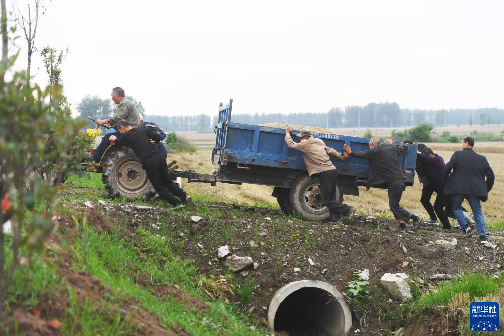 5月30日,在河南省驻马店市正阳县铜钟镇,村民在帮忙推车,车里装着刚收获的小麦。